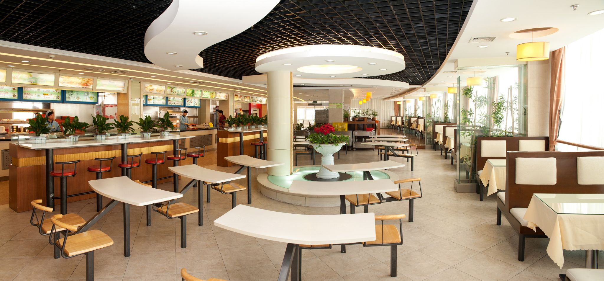 主要以点菜为主,内设12个中式、西式包厢。工作日中餐大厅设教工专窗为教工提供服务。