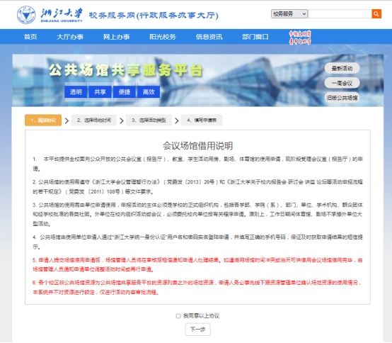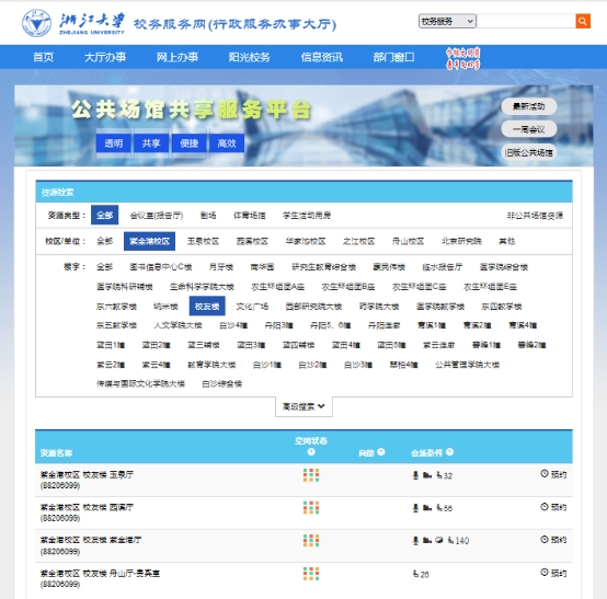 1.进入浙江大学校务服务网,点击“资源类型”选择资源类型再点击“校区/单位”选择需要预约的校区以及需要预约的楼宇,选择楼宇之后再选择需要预约的会议室,找到会议室后点击“预约”。