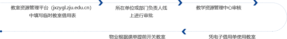 网上下载并填写临时教室借用表—→所在单位或部门负责人签署意见—→教务处华家池校区办公室审核—→教室借用单交物业教学楼一楼值班室—→物业凭教室借用单开关教室
