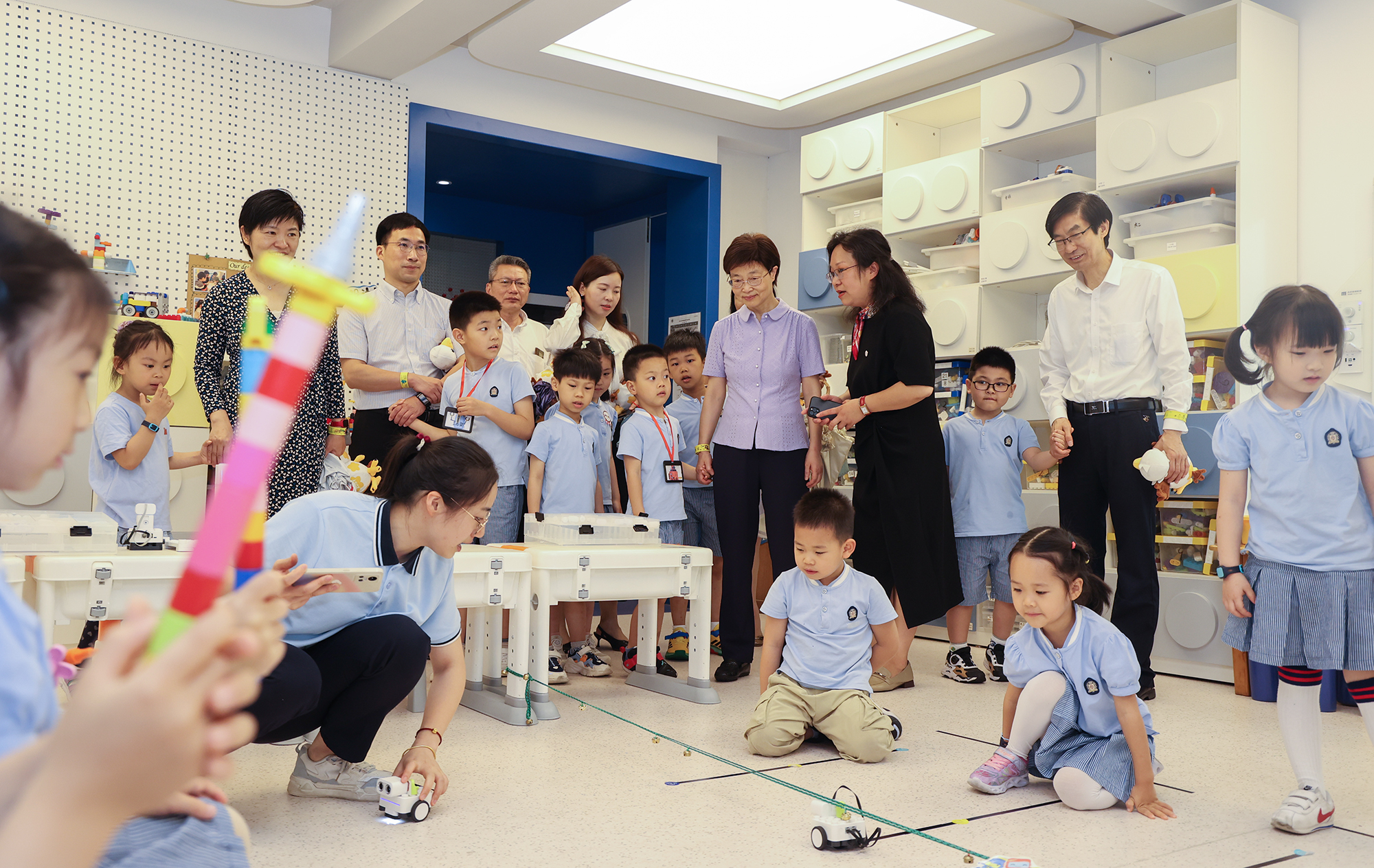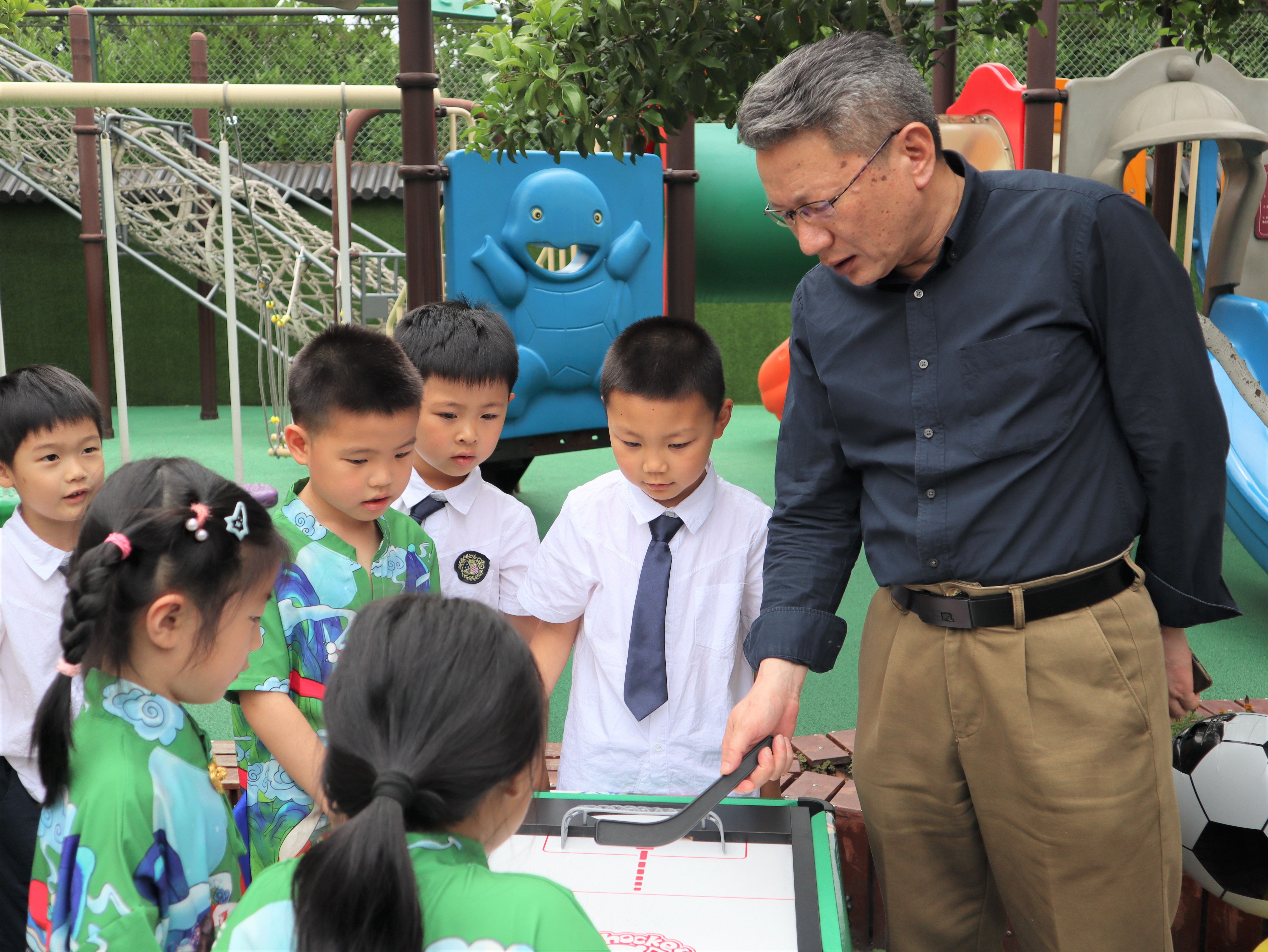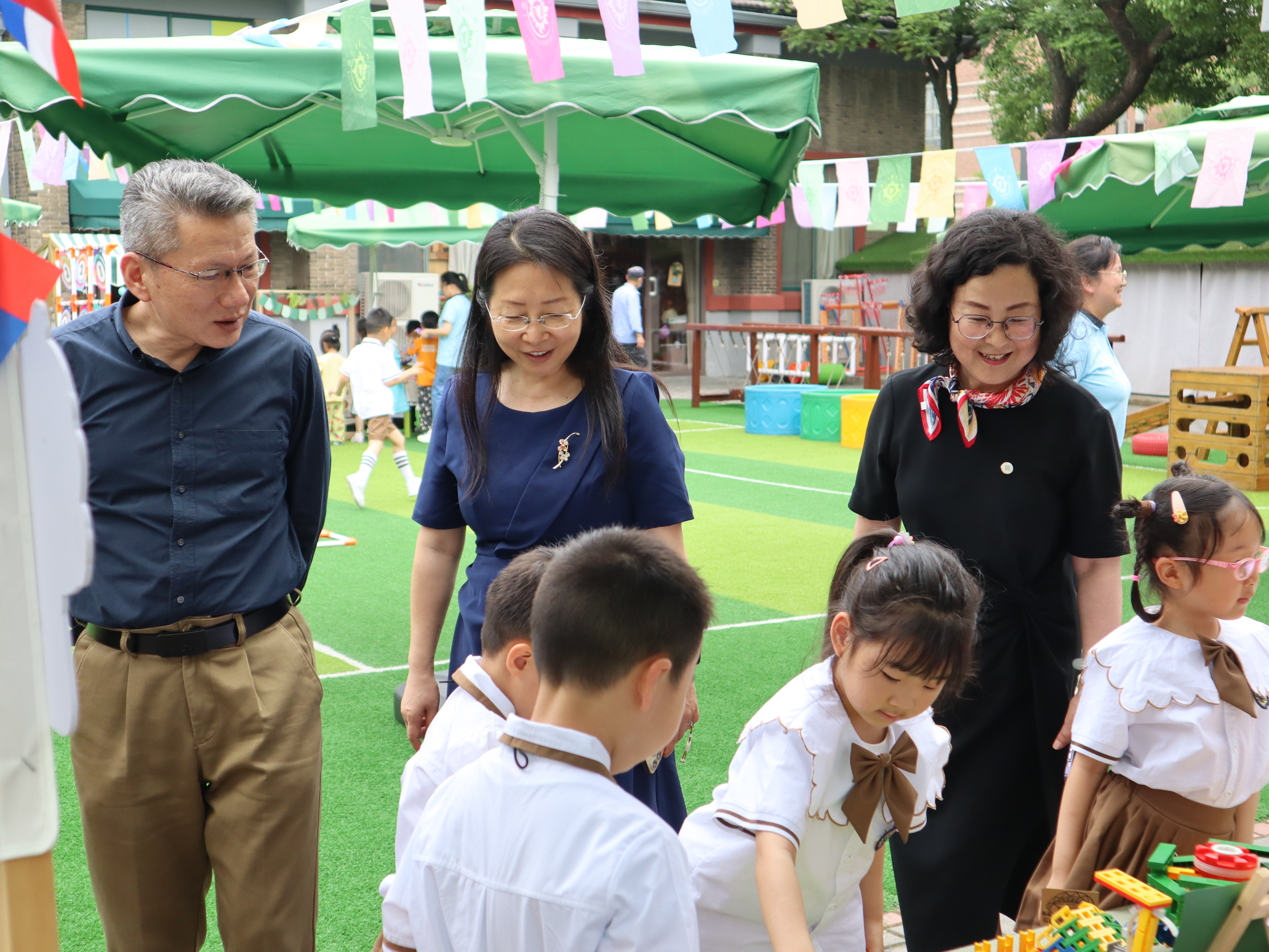 吴健副校长一行先后参观了颇具“学术气”的博物长廊、“情暖六一 让爱童行”爱心义卖、人工智能课堂、机器狗“绝影”秀等,与热情的孩子们拥抱问候,与热心的助教家长亲切交流,在欢声笑语中感受童年的热烈与美好。吴健副校长还向中心主任周熔了解了教职工子女入托、幼儿园运营情况等问题,十分关心幼儿园的可持续发展。校工会副主席陶思丰一行于5月30日上午来到华家池分园代表学校送上了温馨的节日祝福,并表示幼儿是祖国的花朵、民族的未来,让孩子们安全、健康、快乐地成长是大家最大的心愿!