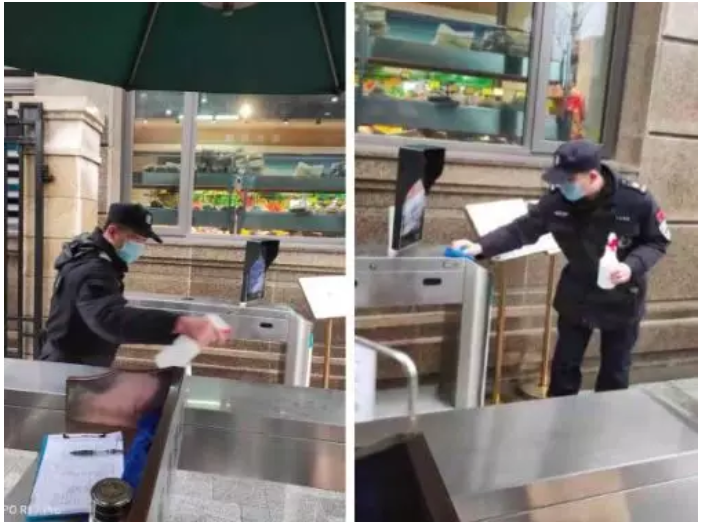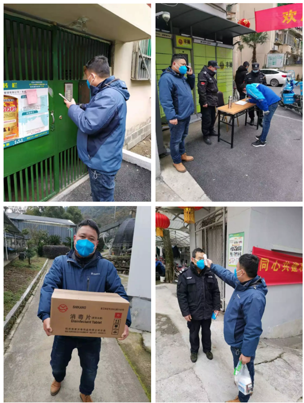 除了距离疫情最近的浙大一院之江院区项目部,求是物业社区项目部也积极做好疫情群防群控工作。给员工分发口罩并指导其正确佩戴;安排员工对楼道、电梯、垃圾投放点、人行道闸等公共区域加强消毒,及时记录清洁消毒进展情况;对进出人员进行体温测量和管控,如发现异常,及时上报;对外来车辆尤其是鄂牌车辆重点关注、严格管控。