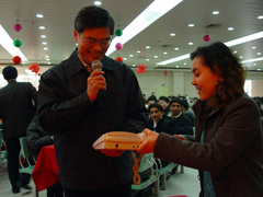 今年,为了丰富年夜饭的内容,除了为留校学生准备了丰盛的晚餐外,学校还精心组织了文艺演出和猜谜活动。精彩的节目为节日增添了欢乐的气氛,大厅里欢声笑语,喜气洋洋。而大厅的一角,同学们正纷纷通过“亲情电话”向家里报平安、送祝福。校领导与学生们一起吃年夜饭、看文艺演出,餐厅里暖意融融。虽然远离家乡,但留校学生在万家团圆的除夕之夜真切感受到了浓浓的温情和大家庭的温暖。