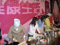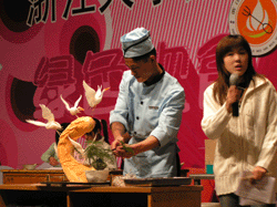 如果说众多风味小吃大饱了学生的口福,那么美食节期间的学生厨艺表演则大饱了人们的眼福。这次美食节学生厨艺表演最初有一百多支队伍报名,经过层层筛选后留下24支队伍,共65人。他们各个是身怀绝技,先不说菜式,就看同学们那熟溜的样子就足以使围观的人们瞪大了眼,啧啧声不绝于耳。