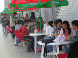 美食广场右边的一排休闲桌椅也是座无虚席,在舞台正对面悠闲地享受美食的人们成为一道美丽的风景线。抱着大堆可口的美味有说有笑的,其中一对两鬓染霜的夫妇神情怡然,嘴里慢慢地拌动着,慈祥的目光投在不远处拥堵的人群中,与旁边狼吞虎咽的年轻人比起来,他们更引人注目。据了解,他们是听说浙大有美食节专程而来的,这次美食节上有很多象这两位老人一样来紫金港品尝美食的。