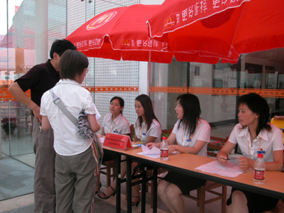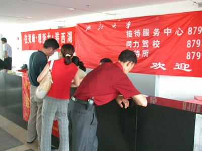 29日下午,虽然秋老虎开始在杭城蔓延,但后勤集团全体迎新工作人员都以饱满的热情投入了各自的工作。在火车站、汽车站等接站点,接待服务中心的工作人员从今天凌晨就开始接到了第一批新生及家长。在新生报到处,后勤集团下属单位都设置了服务台,除饮食公司按学校规定为新生办理粮油迁移手续及发送用餐磁卡外,求是物业公司在新生报到处设立了党员义务咨询服务岗,为新生及家长提供各方面的咨询及指引工作;灵峰山庄、同力后勤公司西溪培训楼、接待中心的服务点一字排开,为新生家长提供住宿登记、返程订票以及短期旅游等服务;通信中心携手移动公司为新生提供优惠的通信服务;商贸公司紫金港教育超市也在新生报到处设立了免费供水点,为新生、新生家长以及工作人员供应免费矿泉水。