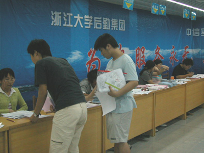 8月29日,浙江大学2005级新生入学工作按学校计划提前半天启动。下午,位于紫金港校区学生活动中心的新生报到处已经聚集了来自全国各地的新生及家长,新生入学的各项手续办理工作都在有条不紊的开展。