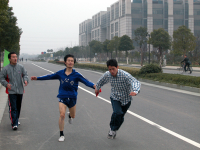 1月7日下午,由校工会组织的2004浙江大学师生紫金港接力跑比赛在紫金港校区举行。由潘明钢、王力群等10位职工组成的后勤集团代表队团结一心、奋力拼搏,最终第一个冲过了终点线,夺得了接力赛教工组团体第一名。