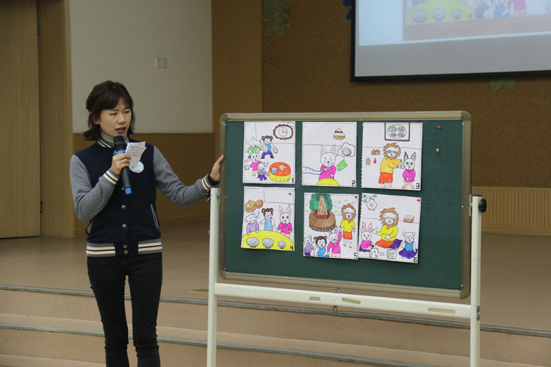 11月25日下午,由各分园三年教龄以内新教师1名、35周岁以下骨干教师1名、30周岁以下青年教师2名组成的4人小组共13个团队齐聚玉泉分园音乐厅,进行“创意故事画”和“绿色创意变变变”两个板块的专业技能展示评比。圆形、椭圆形、三角形等常见几何元素在青年教师们1小时的精心创编和绘制后,呈现出了“小蜗牛找盖子”“做自己的第一名”“神奇的糖果屋”等众多引人入胜的原创故事内容和生动图画;纸杯、纸盘、棒冰棍等常见废旧材料在团队30分钟的设计、制作后,变身为电影放映室、迷宫、钟表等创意教具,并通过思维导图呈现了其应用的教育价值。