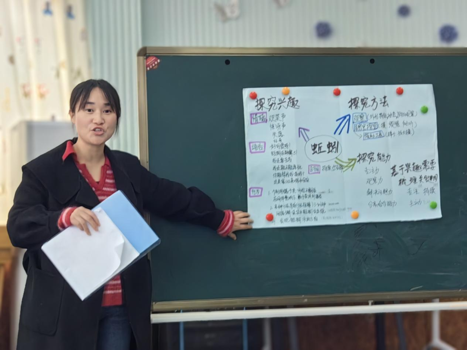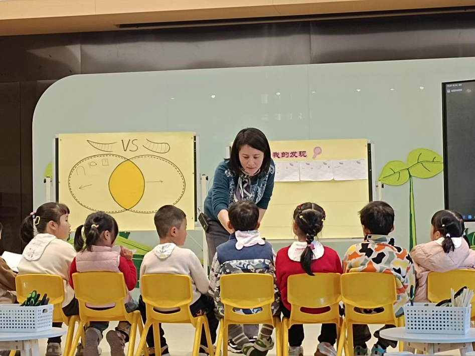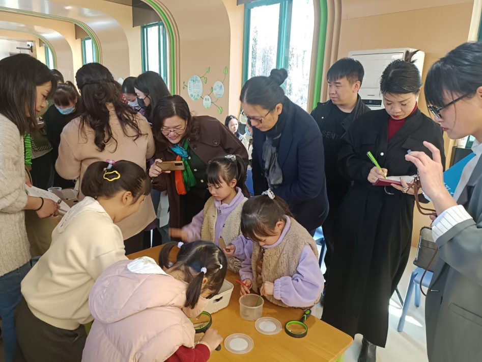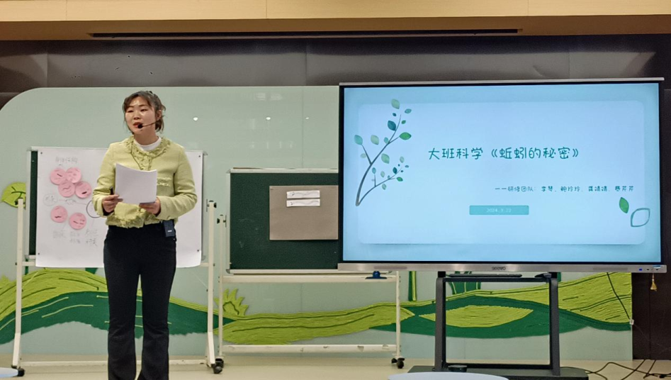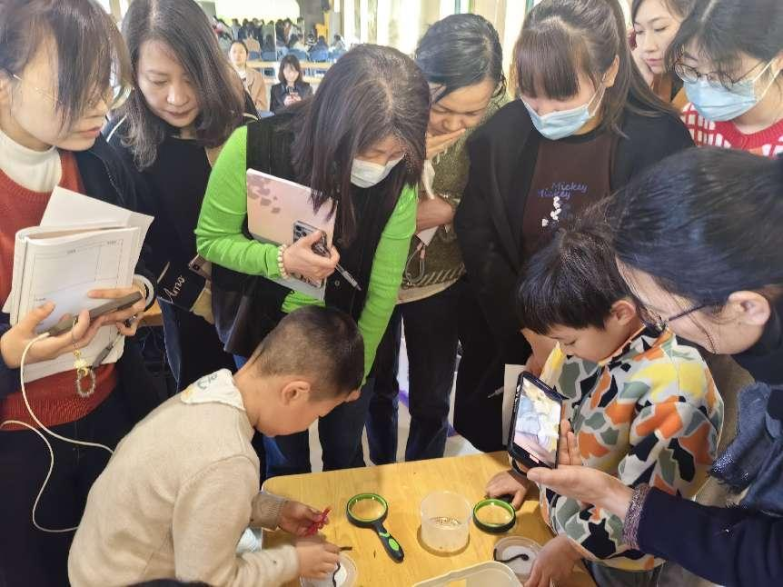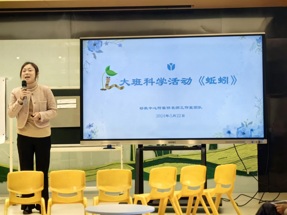 西溪分园柴华和教科室龚靖靖进行课例展示。柴老师聚焦蚯蚓头尾的显著特征,引导幼儿用符号表征记录自己的发现;龚老师引导幼儿在观察、探究、讨论中了解蚯蚓的外形特征、生活习性及相互关系,建立从直接判断到科学循证判断的思维转变。