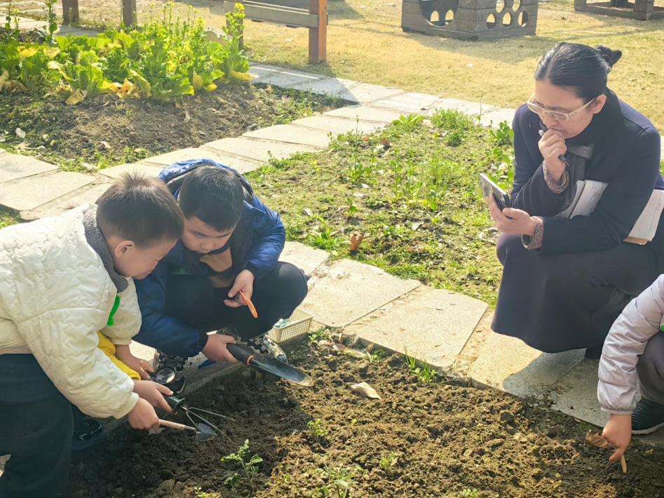 工作室成员、华家池分园副园长冯文君组织孩子们在自然环境下观察、探索蚯蚓,围绕“我的发现”和“我的问题”进行表达表征。老师们围绕观察目标,以观察分析要点与思考指引表为载体,一对一观察、记录幼儿的行为表现及教师的支持策略,进行分析、评估。