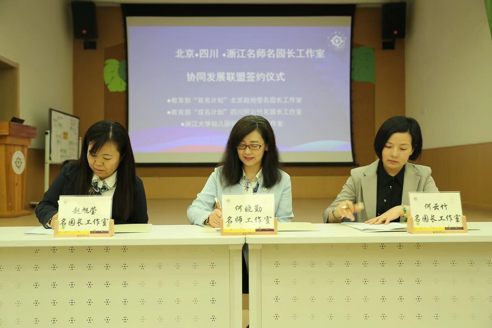 最后,教育部“双名计划”北京赵旭莹名园长工作室、四川何云竹名园长工作室和何晓勤名师工作室进行了“北京.四川.浙江名师名园长工作室协同发展联盟”签约仪式,共同建立了长效协作、互助共进机制。三方互赠了礼物,承载三地友好合作、协同发展的美好寓意。