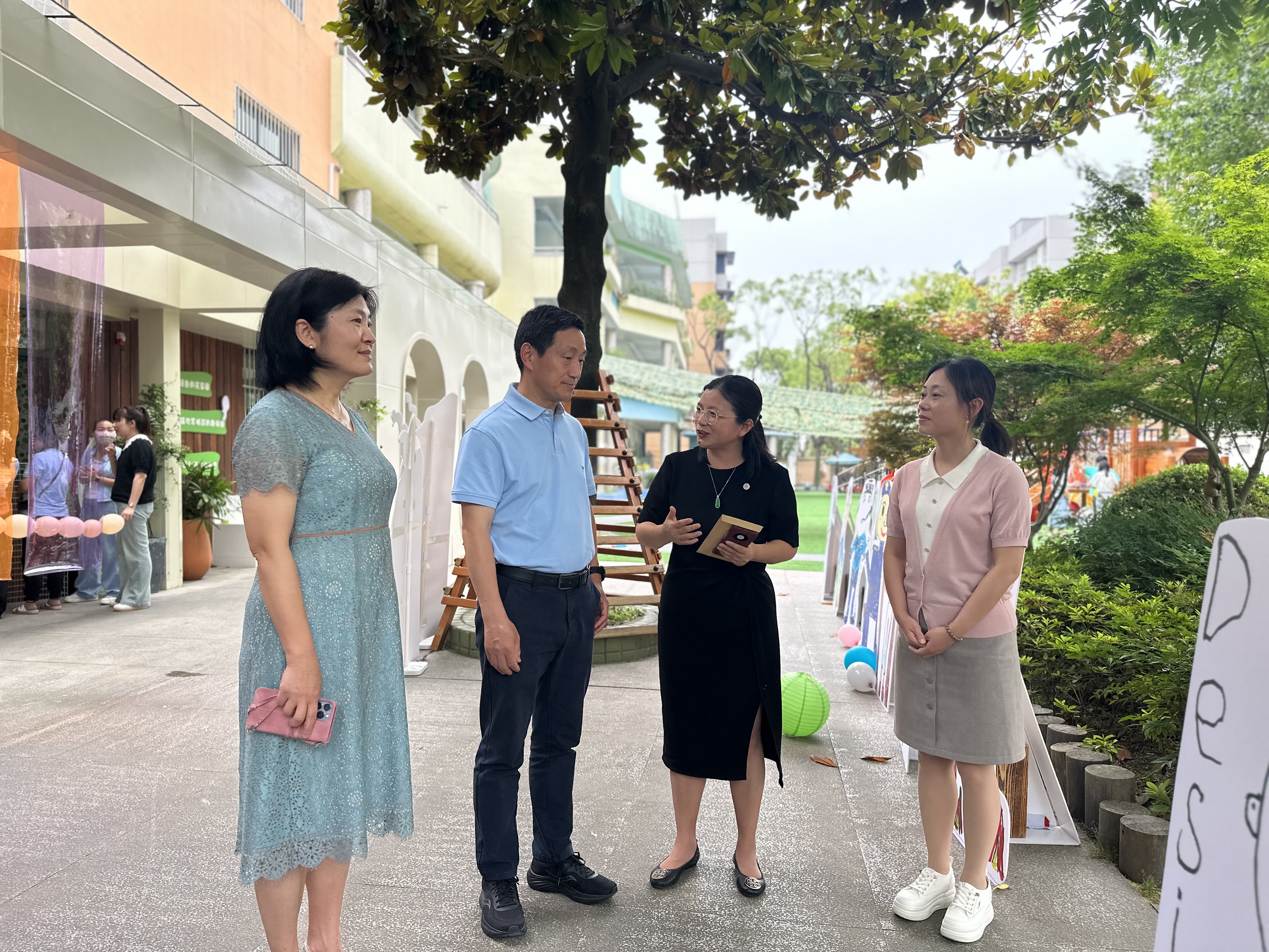 黄翔峰书记一行观看了“AI六一 享成长”“童心‘绘’梦 ‘剧’想未来”幼儿表演,参观了“雏鹰去研学”系列主题展、科技氛围浓厚的博物长廊、“大玩家 小创客”第十九届创客节等,与孩子们热情地拥抱问候,与老师家长们亲切地交流,在欢声笑语中感受童年的美好。黄翔峰书记还向中心主任周熔了解了教职工子女入托、幼儿园运营等情况,十分关心幼儿园的可持续发展。