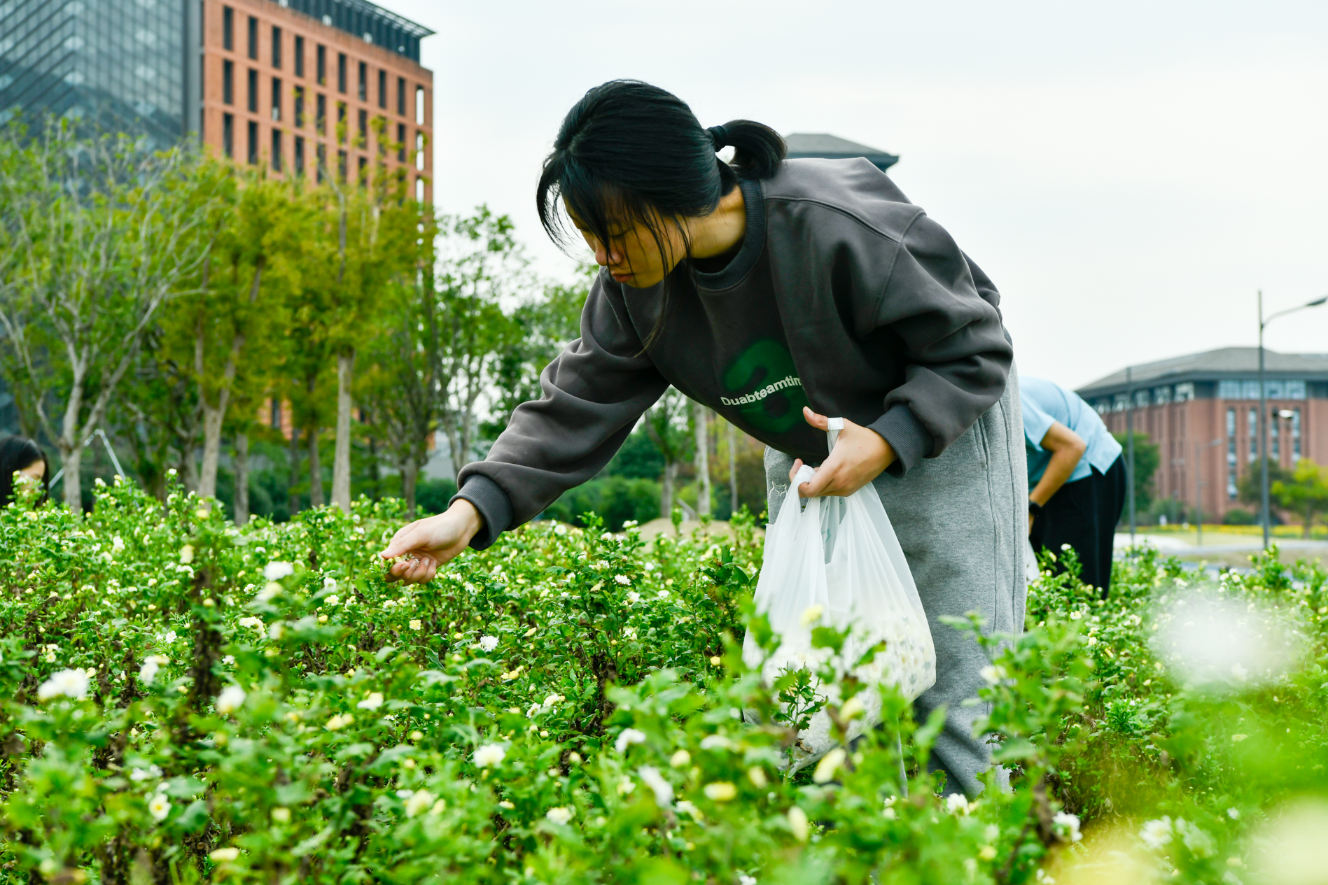 这次组“菊”,是求是物业园林服务中心与马克思主义学院携手组织,开展的“美境”志愿服务之杭白菊采摘活动。