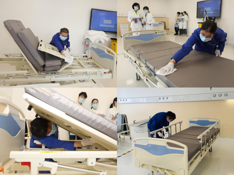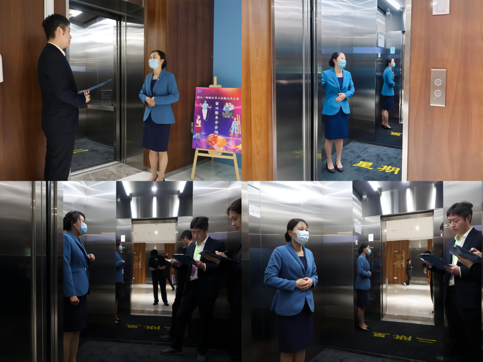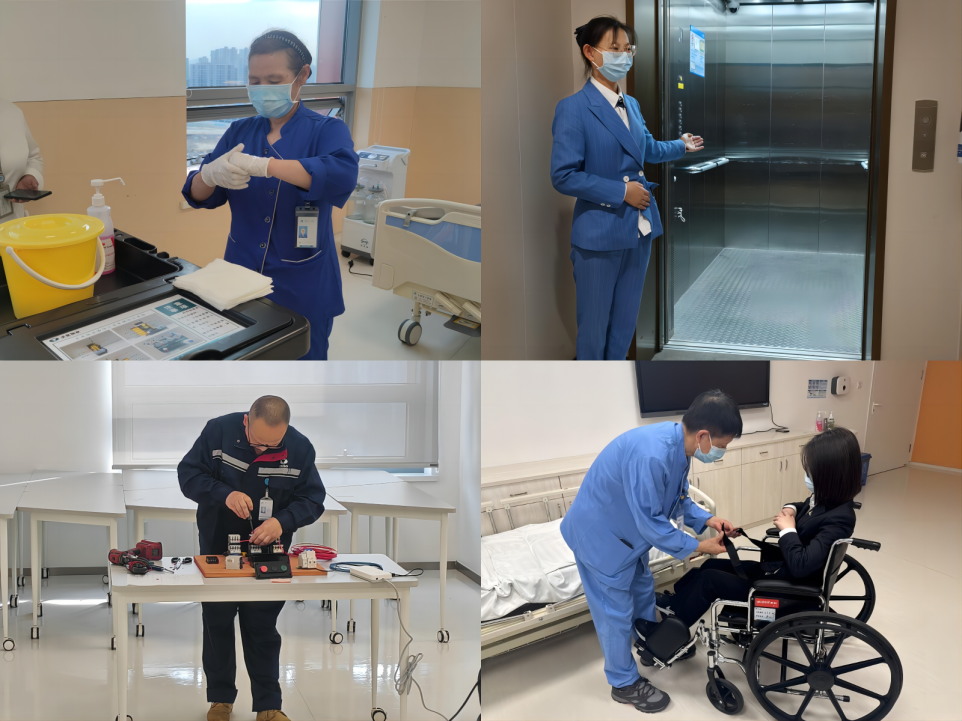 本次比武内容紧紧围绕医院物业日常工作,涵盖保洁、运送、工程、窗口4大板块,包含床单位终末消毒、轮椅推送、控制电路的线路连接调试、电梯司乘突发事件处理4个项目。