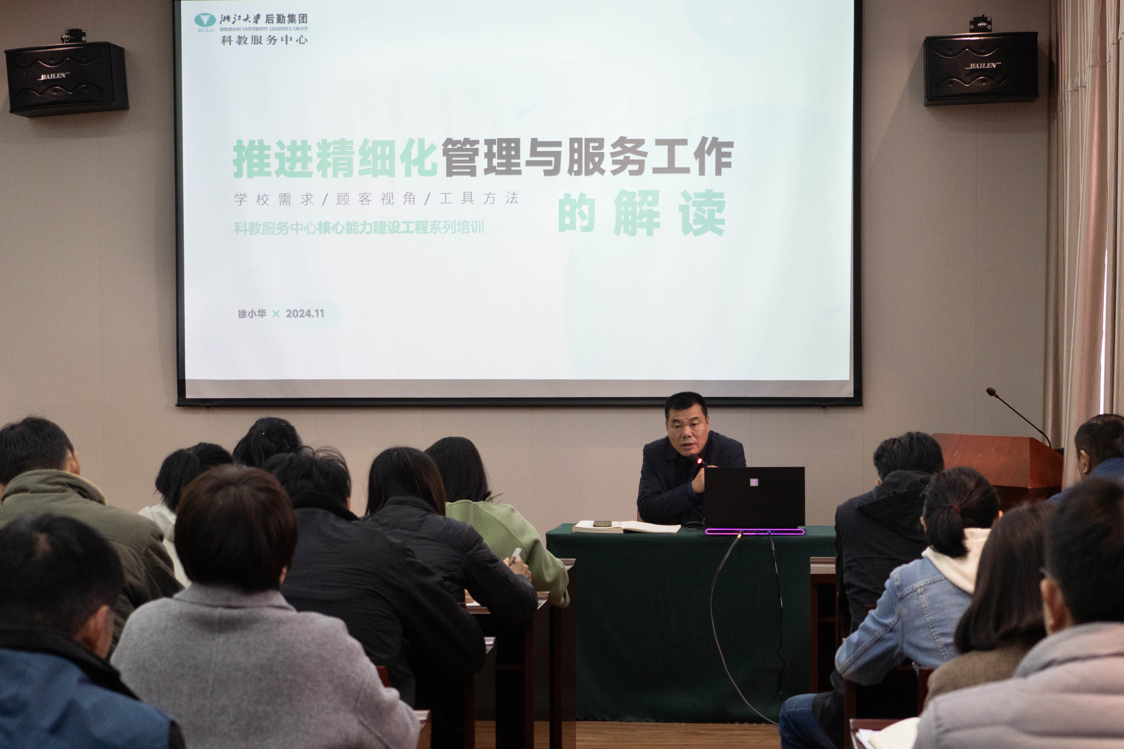 随后,会议进入精细化管理工作推进会的环节。徐小华对精细化管理与服务工作进行了解读。徐小华指出,科教服务中心作为学校后勤保障的重要力量,管理水平和服务质量直接关系到师生的教学科研与日常生活。通过精细化管理,消除冗余、优化流程、节约成本,提升师生的满意度和获得感,对于推动科教服务中心高质量发展具有重要意义。他首先通过分享习近平总书记对城市管理精细化的论述以及马斯克在SpaceX和特斯拉的成功案例,向大家生动地解释了精细化的概念,并结合后勤集团《关于进一步推进精细化管理工作的实施意见》,分析了精细化管理的工作目标。而后,徐小华从“顾客视角”出发,结合生动的管理实践案例分享,以及对岗位分析法、定量分析法、PDCA循环工作方法等精细化管理的工具、方法的讲解,阐述了科教服务中心推进精细化管理工作的具体实施路径。徐小华表示,推进精细化管理与服务工作是一个螺旋式上升的过程,需要我们不断学习、查找不足、完善再进行学习、再完善。推进精细化管理工作要求我们坚持从师生身边点滴小事入手,把“关键小事”当作重要“落脚地”,通过精细化管理理念、工具的应用,着力破解管理与服务中存在的难点堵点问题,真正让师生员工看到变化、见到成效,不断推动科教服务中心管理与服务水平再上新台阶。最后,他结合《科教服务中心精细化管理工作推进方案》部署了今后的精细化工作。