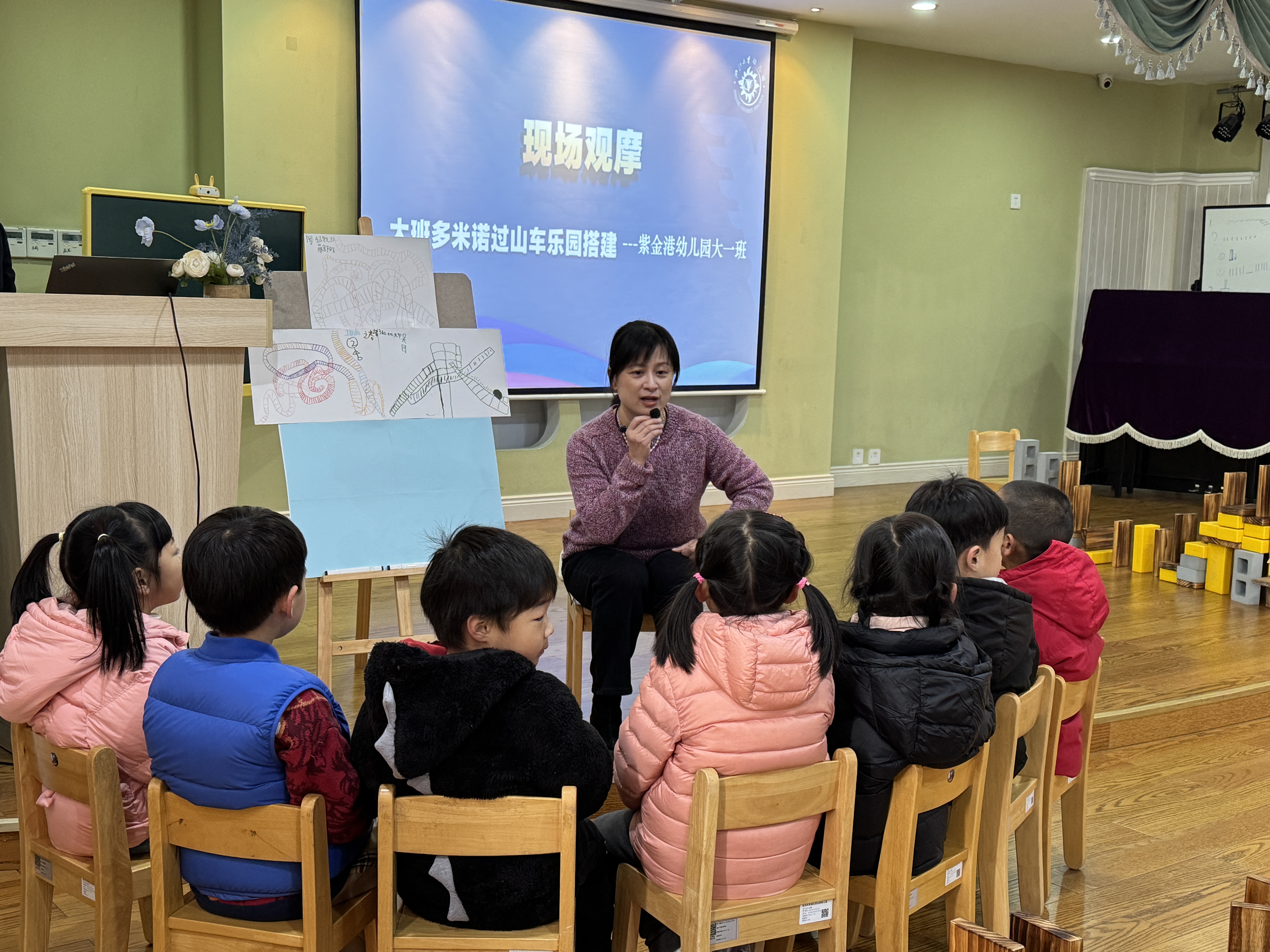 紫金港分园冯珊珊老师组织了大班“多米诺过山车乐园”的搭建游戏。孩子们在之前几次游戏中已经解决了间距问题、转角问题、爬坡和下坡问题,这次游戏的持续性推进又生发了新的游戏挑战,即穿插设计。游戏中,孩子们展现出了高度的专注、坚持、解决问题的能力以及合作精神,给老师们留下了深刻的印象。冯老师针对幼儿在游戏中遇到的问题和难点,组织了谈话活动。通过使用各种支架(如图片、问题引导等),对孩子们不同的穿插设计方式进行梳理,帮助他们构建新的经验和理解。