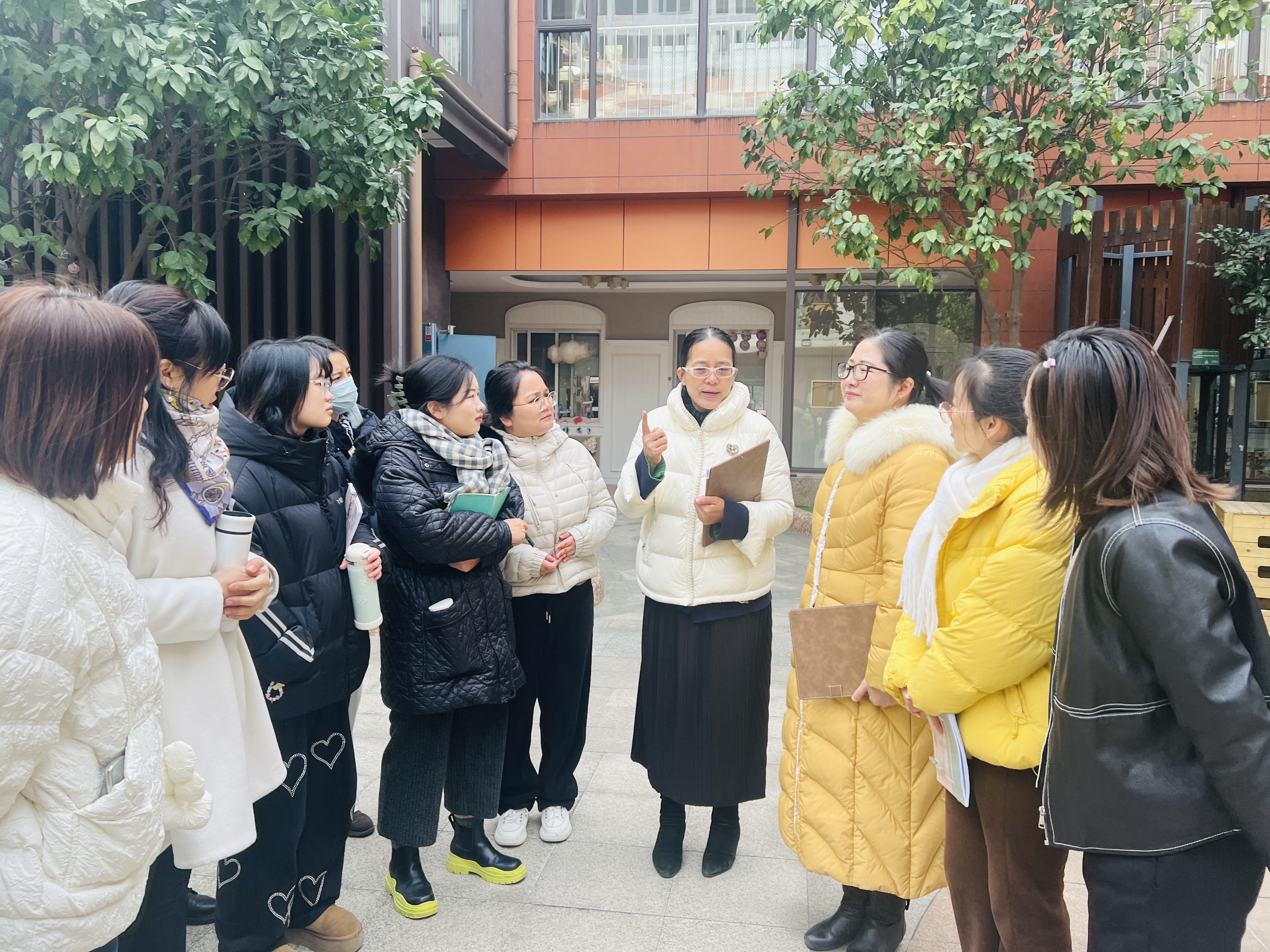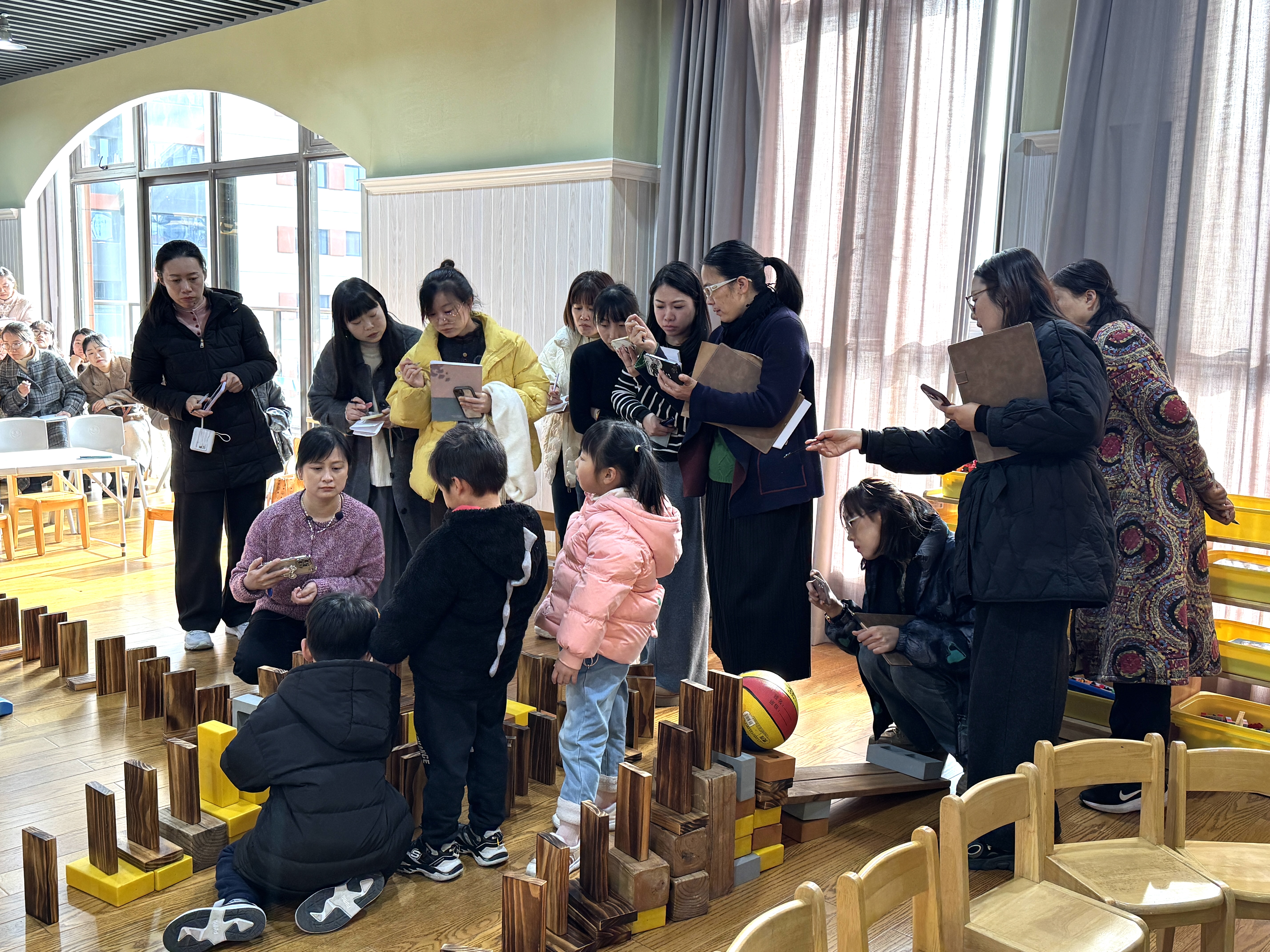 老师们带着学习视角走进了紫金港分园的户外游戏场,感受幼儿园晨间体锻和跑操活动的独特魅力。随后,大家又参观了室内空间创设,发现其空间设计已经打破了传统五大领域的平均主义布局,根据幼儿学习需求进行调整,更加注重儿童的整合性学习体验。