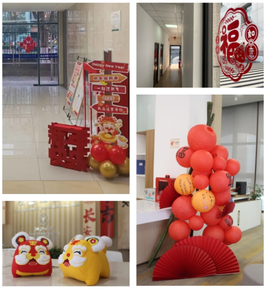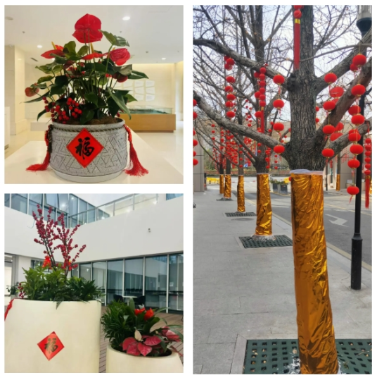 在各项目现场、在物业前台、在员工宿舍……精美的装饰令人赏心悦目,浓浓的新春气息四处洋溢。