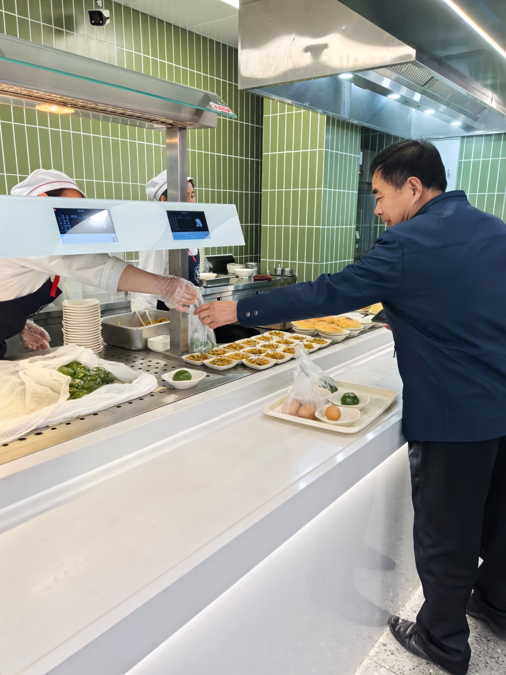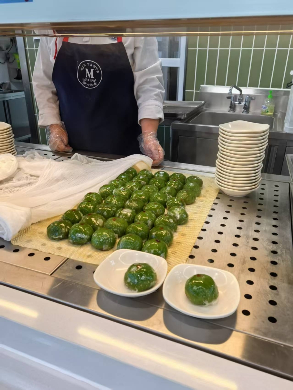 在制作过程中,食堂员工们分工明确,从精心调配馅料到熟练地揉面、包团,每一个环节都做得细致入微。大家充满热情,致力于将这份传统美食完美呈现。活动前期,浙江交通技师学院的食堂开启预定售卖,教职工们反响热烈,仅单日预定量就超过了600个;浙江大学一带一路国际医学院食堂的青团一上市便迅速售罄;浙江大学长三角智慧绿洲创新中心也在早餐时段供应时令青团,广受大家好评。