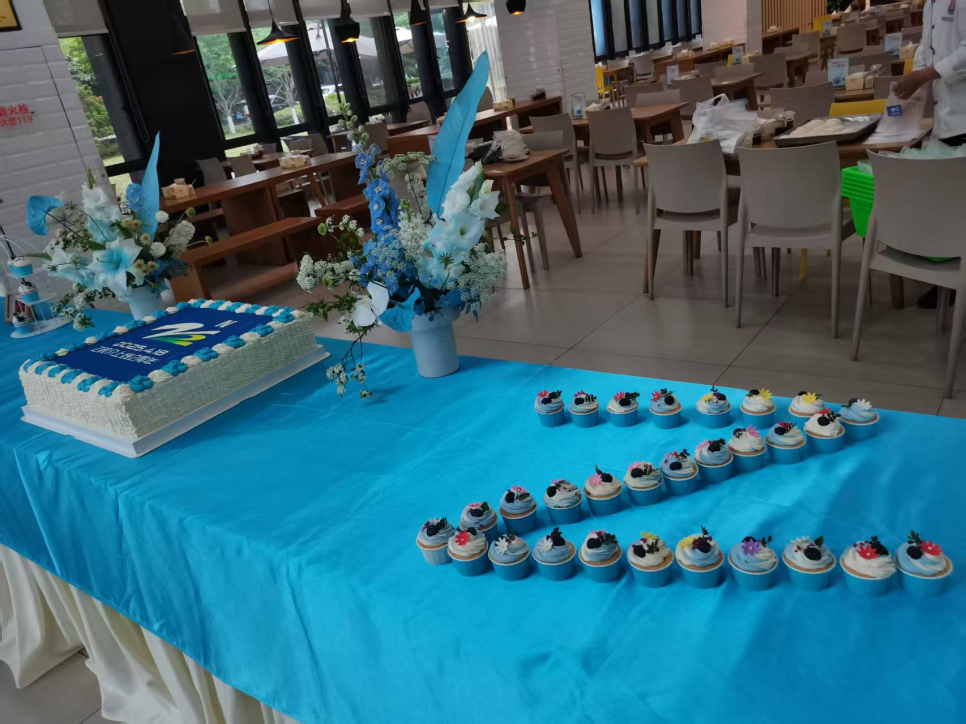 为了庆祝Z视介上线两周年,食堂服务保障团队花费两天时间将员工餐厅改造成了一个沉浸式的庆典空间,以“中国蓝”作为背景颜色,定制了横幅,并将点心以“Z”字形排列,以此呼应品牌标识。食堂的电视屏幕上滚动播放着平台两年间的经典内容片段。“我们既要保留用餐功能,又要营造庆典氛围。”食堂主任带领团队反复强调,确保庆典活动与日常用餐能够无缝衔接。