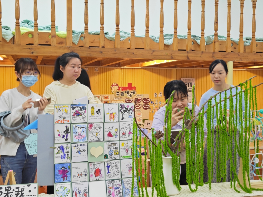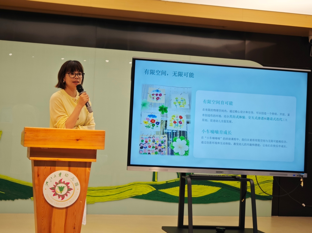 4月23日中午,各班教师代表详细介绍本班学习空间实践过程。14个班级各有特色,基于班级儿童所需精心打造的创意空间,以儿童视角构建“可生长”的环境创设思路:每个角落都是老师与孩子亲历共创的过程,孩子的经验在慢慢积累,老师也不断将学习空间进行拓展,注重链接幼儿园的户外生态游乐场。比如有对幼儿园雨水收集器的探索,有便于幼儿操作的“有趣的温度”实践空间,有种子项目与幼儿园种植地的互动,有扎根在小树林一整年的节气观察等等,经历了与孩子的长期探索与实践,基于项目活动的持续推进也逐步实现了室内外空间的同步迭代。