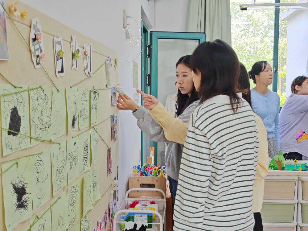 本次环创评比以“走现场、听讲解、共点评”的形式进行。首先,各班老师结合一学期的探索与实践,将整体设计(园本理念的依据)、户外三大空间资源的链接、幼儿活动开展的关键节点过程和班级区域空间的支持、班本项目开展情况等情况上传文本材料至群文件夹。随后,老师们分批次走进各班现场,结合材料对各班级整体环境及空间创设进行全面观摩和讨论,寻找各班学习空间中的亮点。