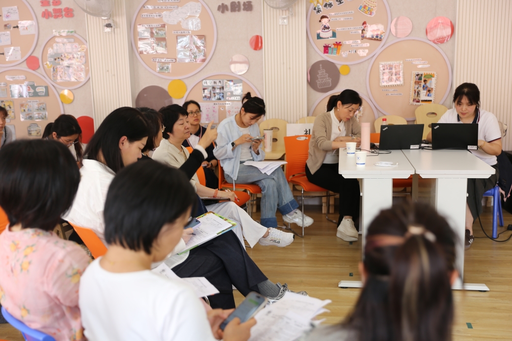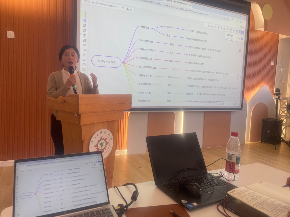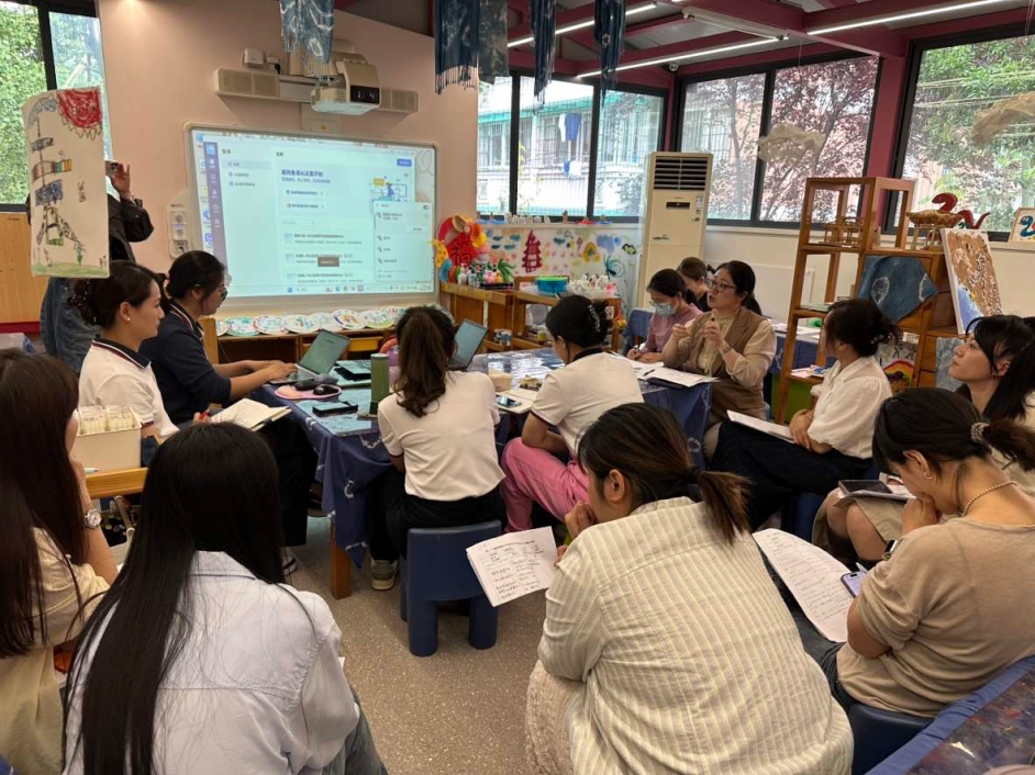 接着,教师们围绕对空间创设的评价以及“观察-分析-评估-支持”的互动模式展开深入交流。大家充分肯定园所整体文化体现智能元素、可持续发展主题等创新亮点,同时提出班级区域材料的年龄特点以及材料的多样化低结构可更加凸显、区域活动生成与生活有关的小项目活动并以小项目形式推进等建议。