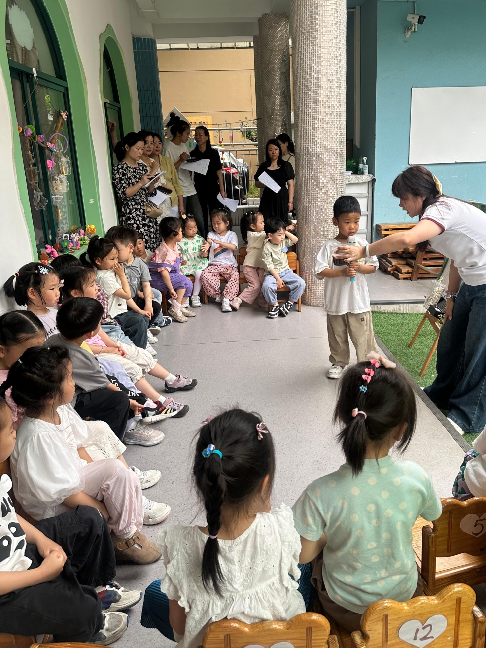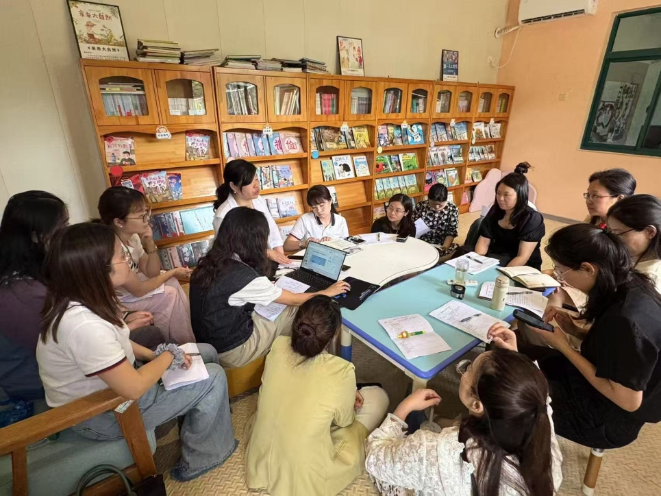 在集中汇报阶段,大家对华家池分园区域空间拓展给予肯定,如通过构建“材料吧”资源平台整合低结构材料与自然物为幼儿的自主探索与创造性游戏提供有力支撑,借助动态记录墙与即时贴等载体支持幼儿真实问题讨论与学习过程可视化等。同时,教师们也在“游戏流程图/步骤图”、幼儿作品呈现的多元化、体现并促进幼小衔接能力的材料提供需要等方面提出了一些建议,并着重表示教师在游戏活动中要主动倾听幼儿需求,实现个性化发展支持。