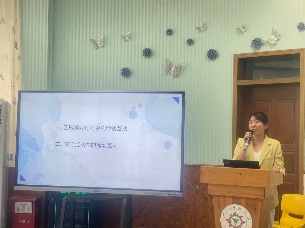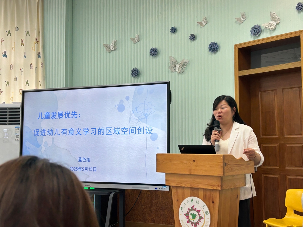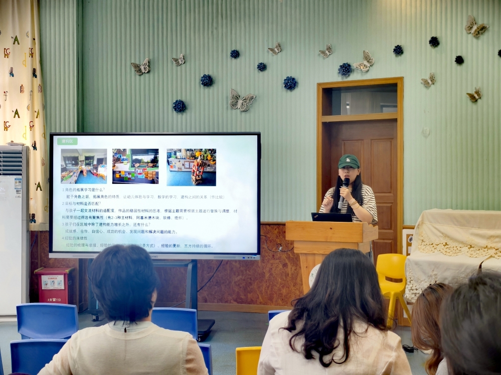 根据中心对本次研修活动的定位和要求,针对各分园如何基于问题更好地实现“空间育人”理念,转变观念,华家池分园业务园长冯文君面向园区空间创设的现实困境,以研修赋能为基础,提出三大核心策略:一是推行弹性分区模式,打破传统空间界限,构建多维联动的动态学习场域,为幼儿创造灵活多元的学习环境;二是推动课程转化机制,将教育目标与幼儿兴趣相结合,促使儿童经验实现螺旋式生长,深化学习效果;三是建立持续性观察评估体系,构建支持性动态学习体系,全方位促进儿童的有意义学习。