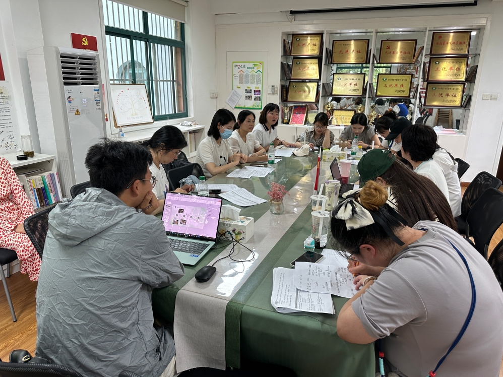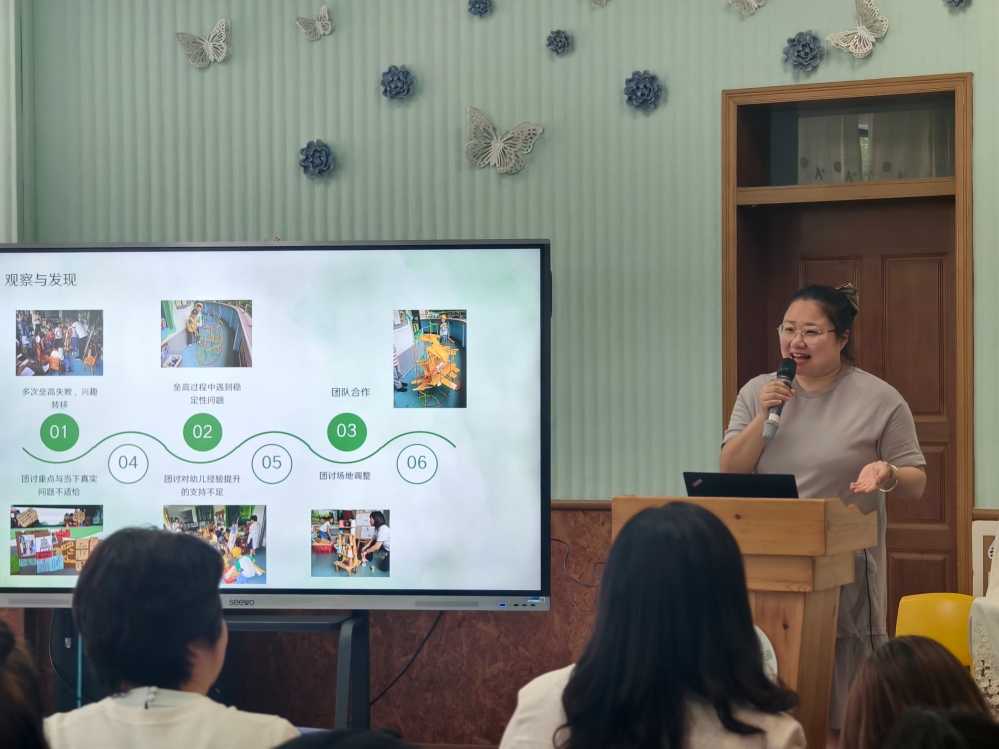 观摩后,研修教师们以小组为单位展开研讨。开放班级老师先进行了活动阐述,小一班王倩老师以探玩区“奇奇妙妙屋”游戏为例引导幼儿在游戏中发现沉浮的秘密,探索声音的特性并大胆地表达分享自己的发现;中三班楼珊老师重点聚焦如何搭建“环球中心”楼身宽窄问题,引导幼儿在实践、讨论中分析设计是否合理、材料是否合适、结构是否稳固等关键要素;大四班冯娟老师围绕“古法造纸”活动交流实践问题,发现并强化幼儿的协作意识与探究能力。随后,研修教师针对空间创设和空间学习中的师幼互动展开深入对话。