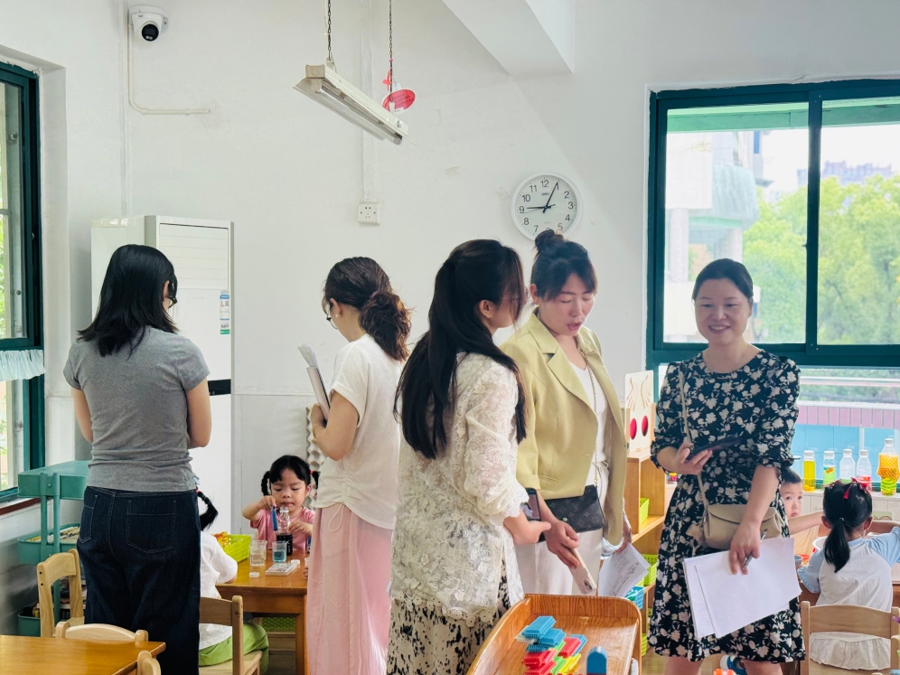 研修教师手持“一单两表”观察工具,深入各班级,对学习空间创设进行沉浸式观摩与诊断,包括空间布局规划、内容主题设置、材料投放的适宜性与开放性等。随后,教师分组进入小、中、大班指定班级,开展学习空间及谈话组织活动的观摩。依托“空间学习中的师幼互动”观察量表,教师们采用行为分析法记录幼儿在区域活动中的探索行为、思维发展、社会性表现及经验迭代过程。
