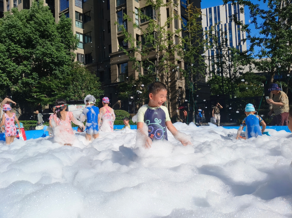 活动筹备彰显匠心。活动当天,项目部员工早早便投入到活动筹备工作中,布置泳池、调试泡泡机、准备游戏道具……在确保安全的前提下,项目部为小业主们打造了一个童趣与清凉并存的欢乐泡泡世界。下午4点,随着泡泡机的全力运转,云朵状的泡沫喷涌而出,泳池慢慢便被洁白绵密的泡泡填满。提前来到现场等待的大小业主们发出阵阵欢呼声,活动正式拉开帷幕。
