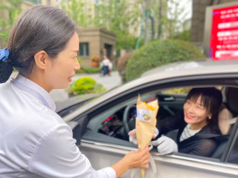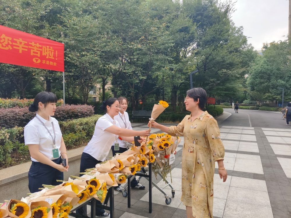 “老师,您辛苦了!祝您教师节快乐!”手捧亲手包装的鲜花,物业员工面带灿烂笑容,在小区门口向每一个进出的教师业主送上礼物与问候。