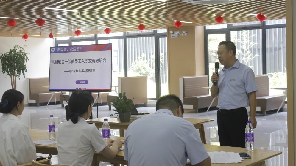 会议在上午的新员工入职交流教培环节中拉开帷幕。杭州项目一部经理周自明发表致辞,他对加入杭州项目一部这个集体的新同事们致以热烈的欢迎,并阐释了公司的企业文化、发展愿景以及对人才的重视与期许。周自明强调,新员工是公司项目部发展的新鲜血液和重要力量,希望大家能快速完成角色转变,将个人成长与公司项目部发展紧密结合,在实践中学习,在协作中进步。