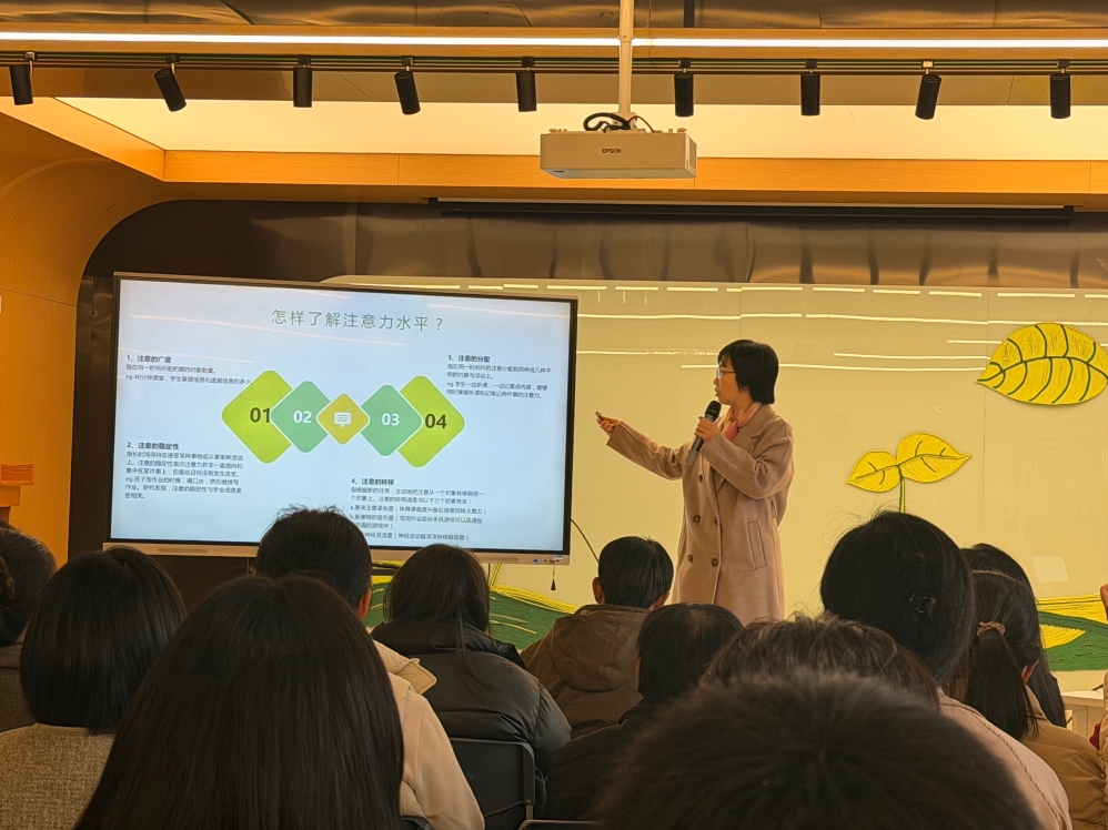 讲座一开始,项主任就抛出了问题“你对孩子的注意力是怎么理解的?”,家长们纷纷分享在育儿过程中遇到的种种困扰。围绕儿童注意力与行为发展,项主任重点讲解了注意力的定义、分类、培养方法及“广度、稳定性、分配、转移”四个维度,强调“有意注意“在3岁后逐步发展。结合幼儿年龄特点,项主任认为家长应通过游戏化方式促进注意力发展,推荐舒尔特方格、听觉指令游戏、扑克牌和乒乓球等低成本亲子活动,同时指出家庭环境、养育方式对注意力的影响,倡导“适度关注”与高质量陪伴。针对行为管理,她提出三句核心原则:调整不合理期望、强化良好行为、忽略非危险性不良行为,帮助家长科学应对常见育儿挑战。