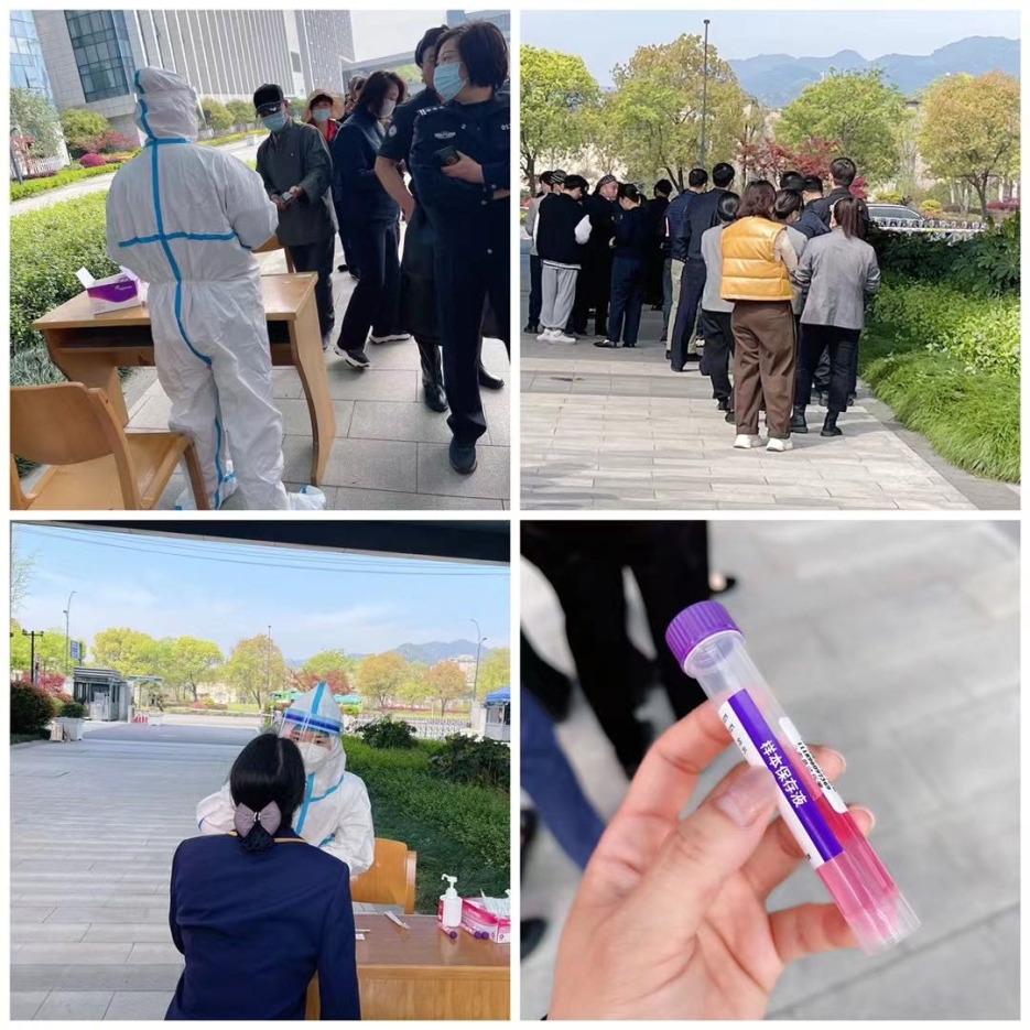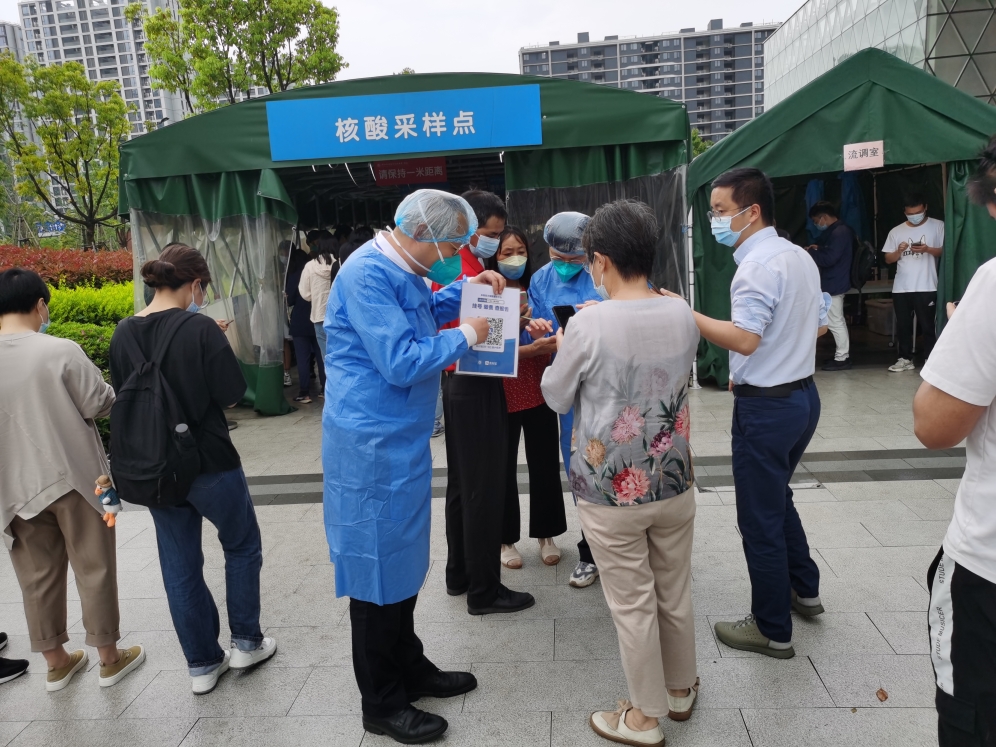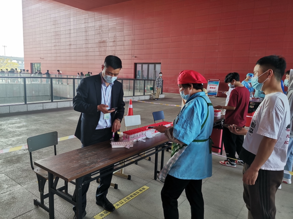 与此同时,浙大玉泉校区的核酸检测工作也在有序进行。除了做好场地布置任务外,求是物业公司第二党支部还穿上了“大白”服,积极投身核酸检测志愿服务工作中去。经过专业培训,他们和医护人员一起逆行而上,指导现场人员出示健康码,登入信息,做好试管贴标工作,大大提高核酸检测效率。以“抗疫有我,有我必胜”的决心,共同筑成防范疫情的钢铁长城。