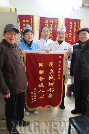 12月13日,浙大求是社区书记张利华与两位离退休老同志,将写着“用真诚树形象,用服务暖人心”的锦旗送到饮食服务中心玉泉餐饮 中心五、六食堂,感谢食堂一如既往地为老同志们提供美味可口的饭菜和热情周到的服务。