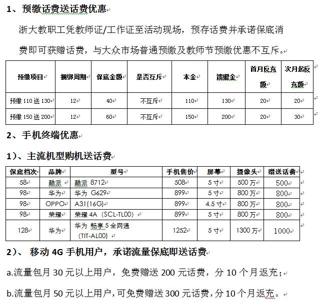 为更好的服务浙大,为广大师生提供优惠、便捷的通信服务。通信中心联合中国电信、中国联通、中国移动在5月17日“世界电信日”期间开展电信日主题服务活动,具体服务方案如下: