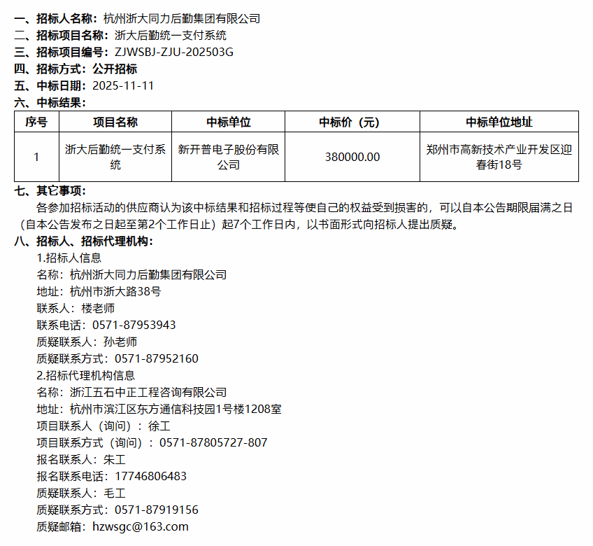 杭州浙大同力后勤集团有限公司浙大后勤统一支付系统中标结果公告