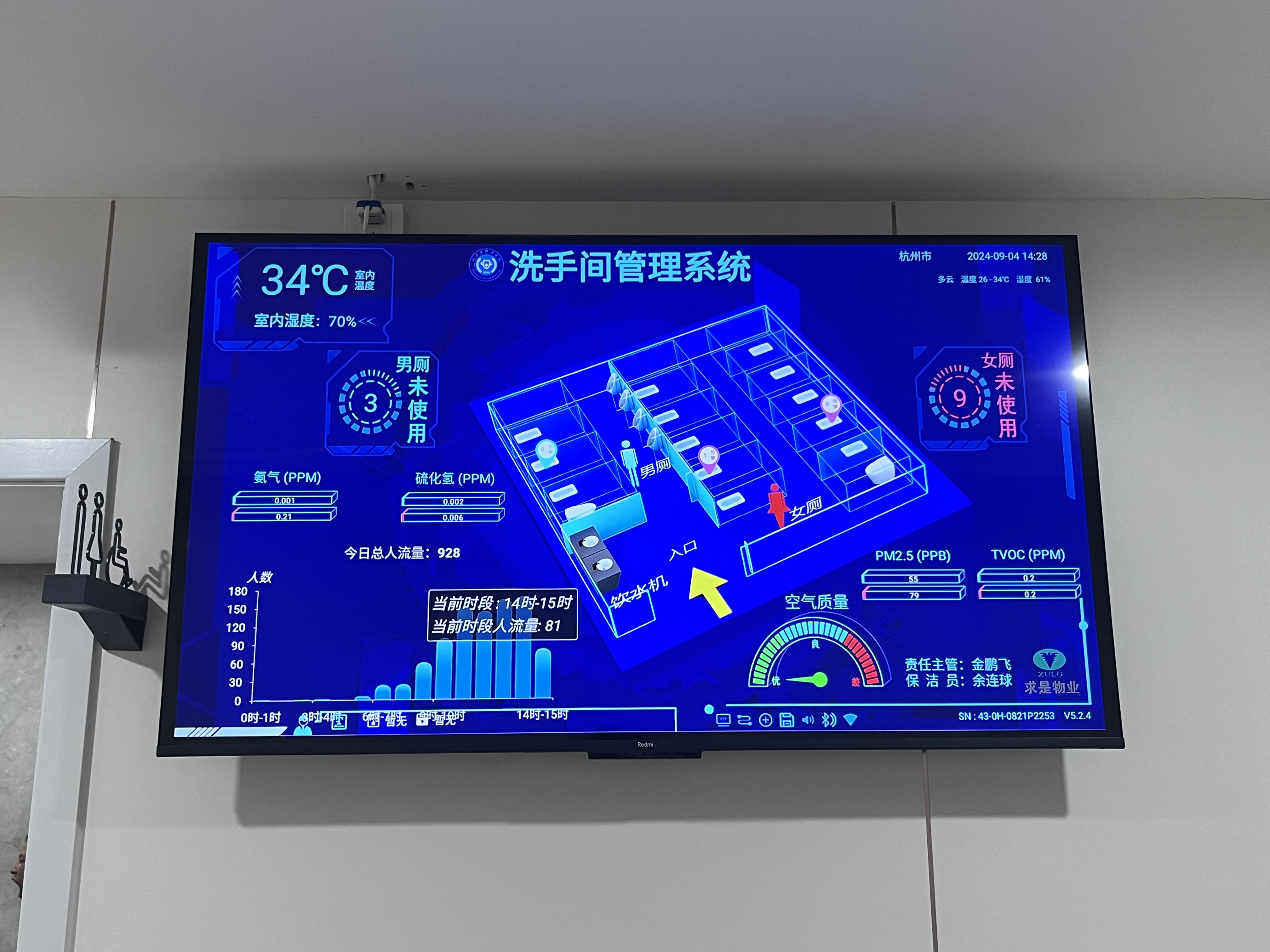 一屏缓解厕所难题。项目部特别引入智慧卫生间管理系统,实时监测、实时反馈,有效缓解高峰期间厕所排队问题。