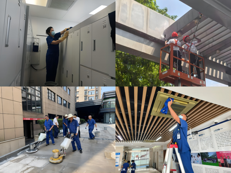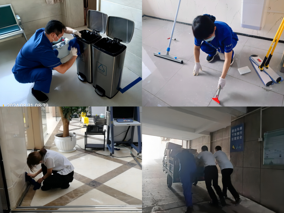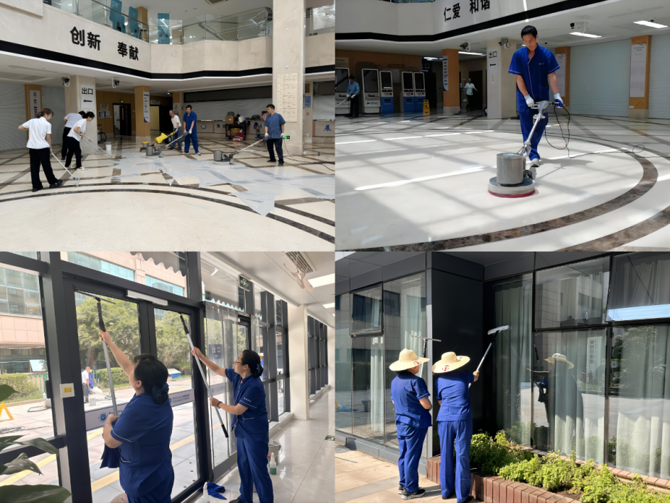 在保障小组的带领下,全体人员绷紧弦、铆足劲,按照计划,分区域推进全院深度保洁工作,并着重开展了PVC打蜡、玻璃清洗、石材晶面清洁等专项精细保洁。