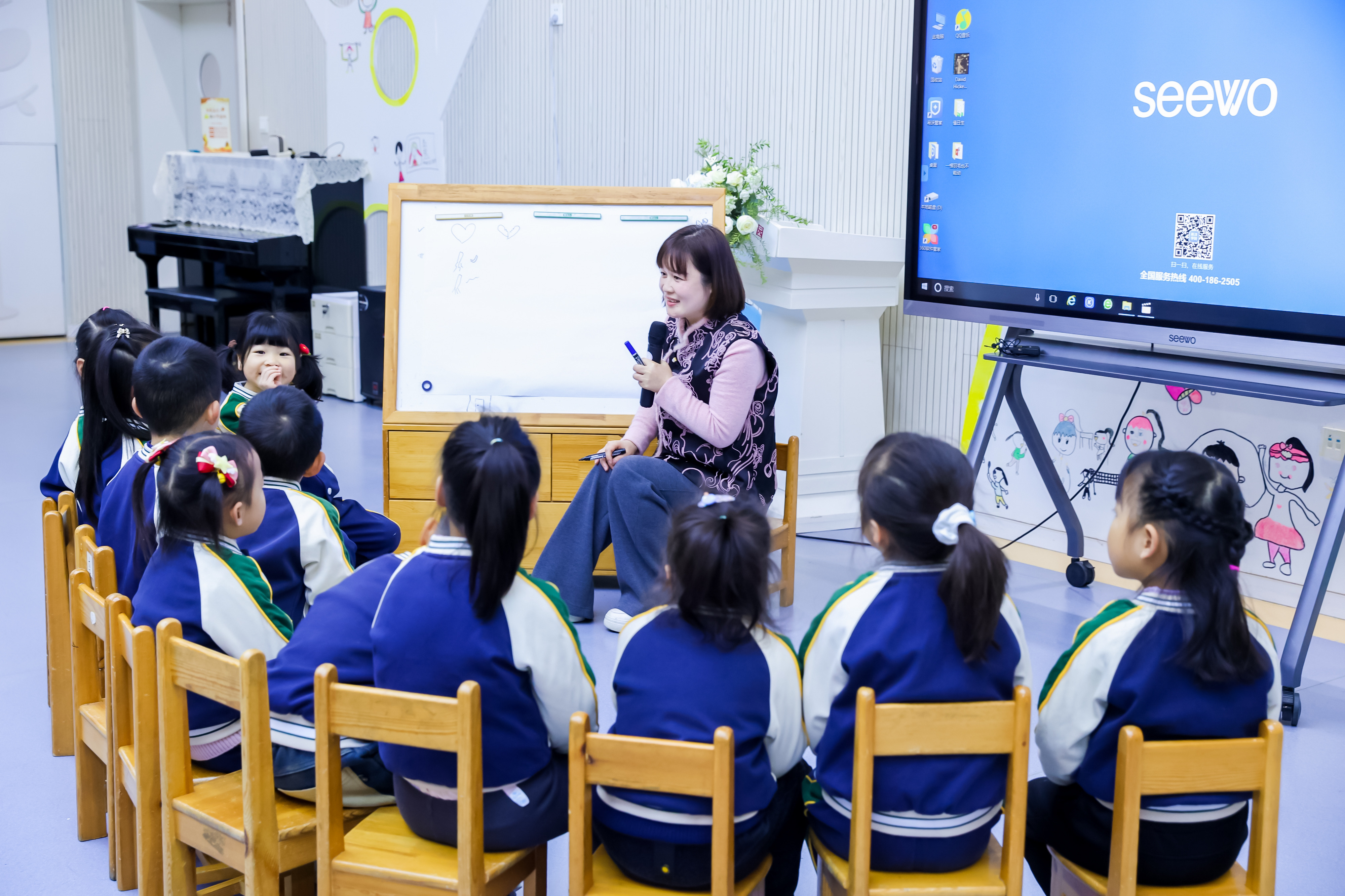 27日,实验园园长助理、儿童哲学教研组组长楼梦娜现场展示教学大班儿童哲学活动《机器人可以当值日生吗?》。活动生发于“开展值日生活动时,部分幼儿表示扫地太麻烦并不愿参加该劳动,还有幼儿提出把家里的扫地机器人带来班级使用”这一真实事件。活动重点针对“如何支持幼儿辨析地看待智能劳动工具,并尝试探寻劳动的意义进而维持做值日生工作的兴趣”做了师幼哲学对话探讨。