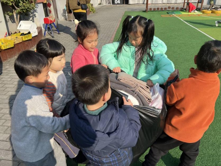 孩子们抱着沉甸甸的衣物包裹和爸爸妈妈早早来园,在各园区的捐赠接待点有序登记、摆放。浙大幼儿园近百位教师全情投入,按照小、中、大班年龄段进行分类打包,每一件童装都饱含着“浙小鹰”的爱心与祝福。