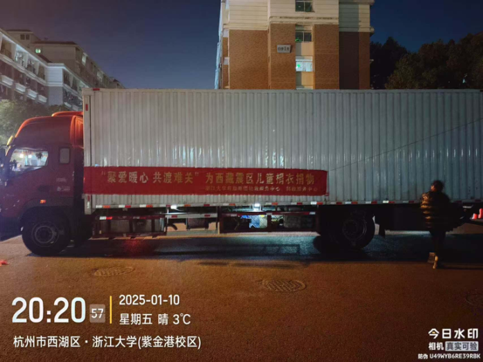 1月10日晚,一辆近10米长的厢式大货车从浙江大学紫金港校区出发,满载7000多件慈善物资,开往西藏自治区日喀则市拉孜县,为地震灾区的儿童送去温暖与爱心。