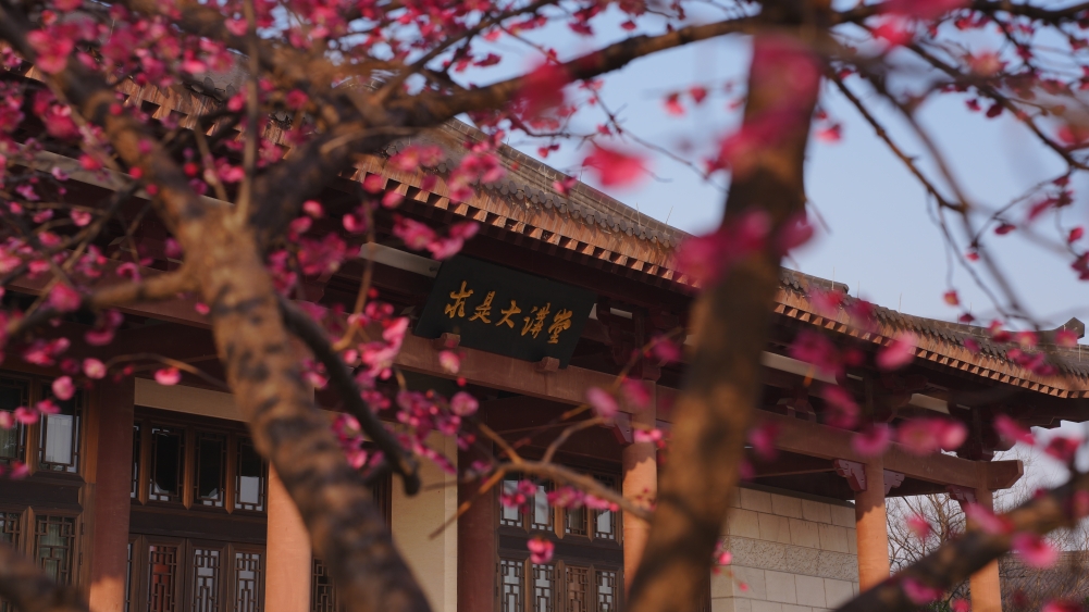 漫步于求是大讲堂边的步道,数十株梅花树整齐排列。梅花沐浴书香,更显雅致与韵味,俏立枝头,风光无限。