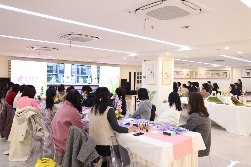 活动特别设置了香薰手工制作环节。美通香薰工艺师现场向大家介绍了香薰的功效、材料及制作流程,学员们精心调配个性化香薰蜡片,并通过品鉴檀香、茉莉、雪松等十余种天然精油,学习压力纾解、情绪调节的芳香疗法。香气在指尖流转,学员们化身“调香师”,理解着“以香传文化”的品牌理念。